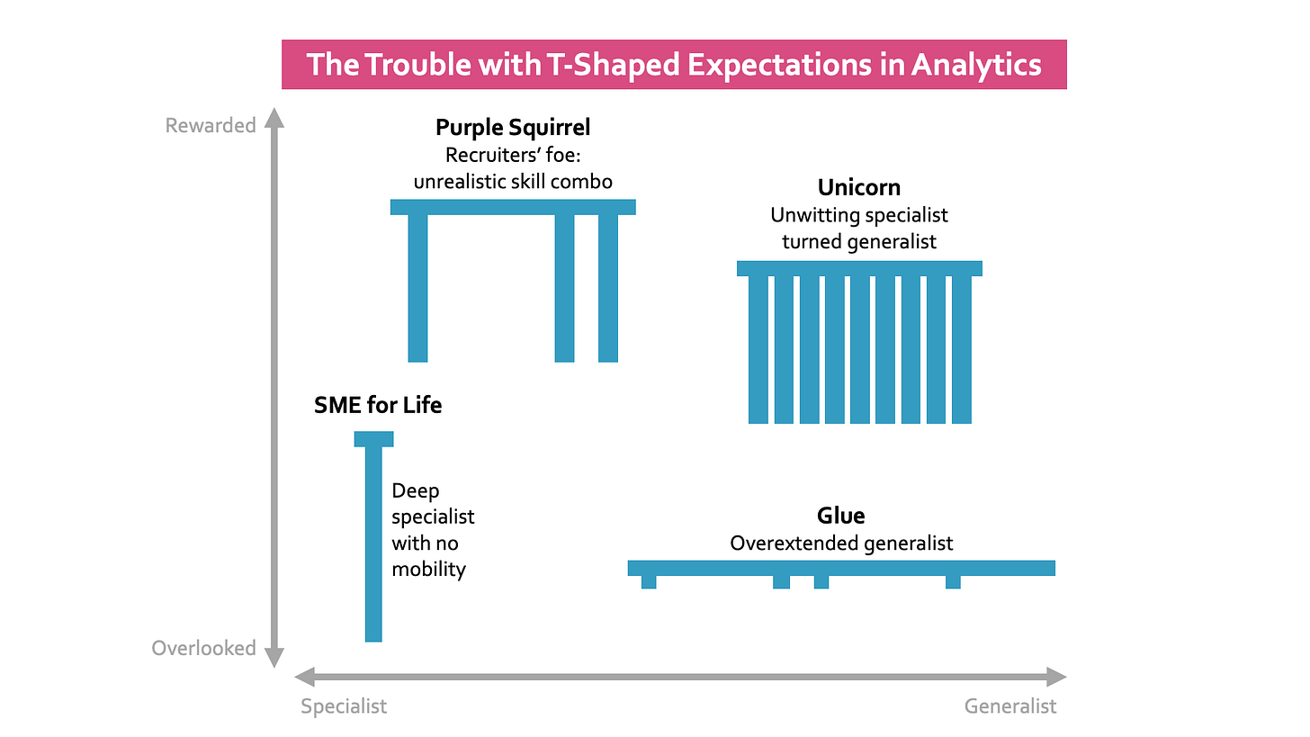 I’ve seen the T contort and fail in analytics, many times over many years. Specialists who load up on adjacent responsibilities until they burn out. Experts who fall into a deep niche and get trapped there. Generalists who never find the right fit and wind up as invisible gap-fillers. You’ve probably seen it, too. Maybe it’s happened to you, or to people you manage.